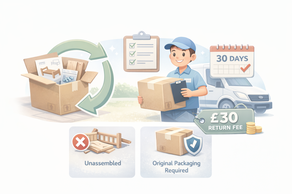 We organise the collection for you. A £30 return collection fee applies and is deducted from your refund.